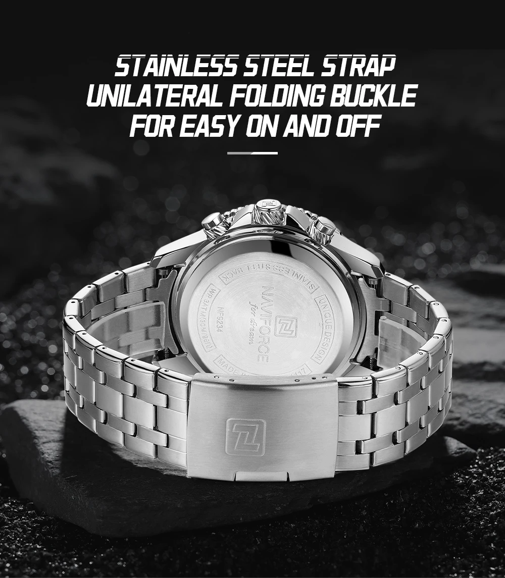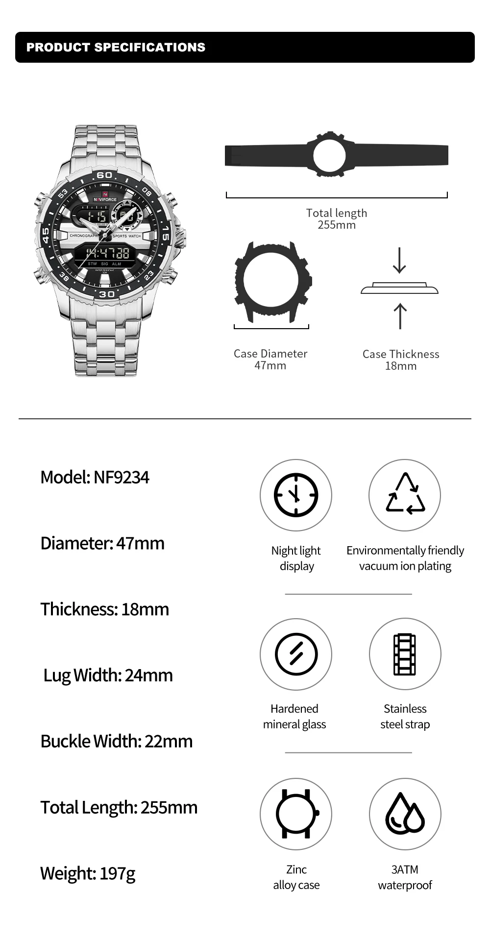 Feature: 30M Water Resistant, Day、Date、Dual Time Display, Alarm, Chronograph, Luminous