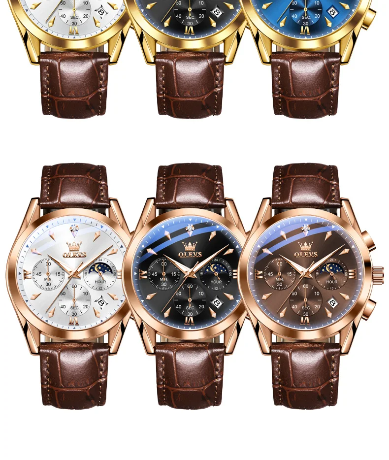 OLEVS Luxury Men's Watches Leather Strap Waterproof Luminous Chronograph Moon Phase Man Watch Top Original Quartz Watch for Men
